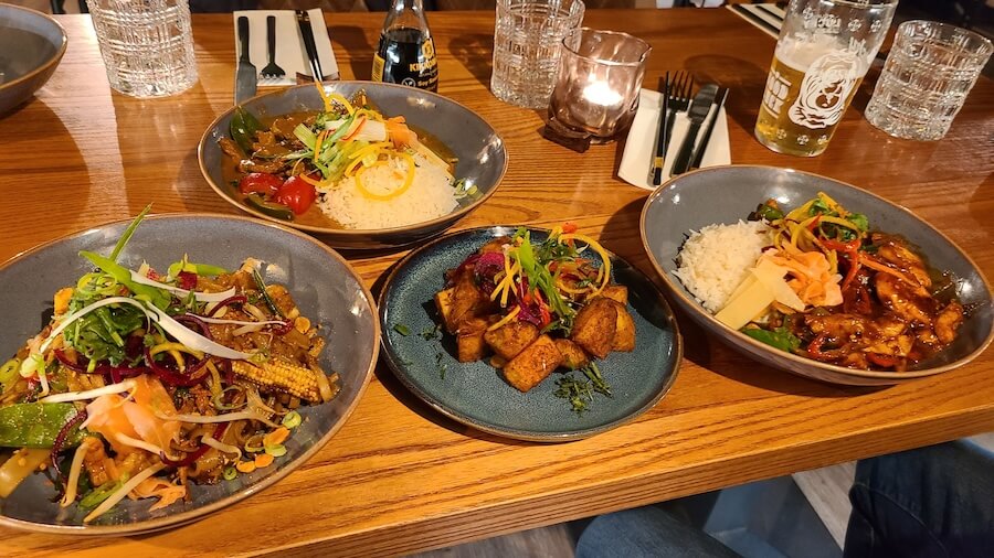 Whether you’re a meat eater, a veggie or a fish aficionado, all the curries and noodle and stir fry dishes can be paired with beef, prawn, chicken, halloumi or aubergine. And all the dishes can be shared – the serving staff are only too happy to provide extra plates for the overload!